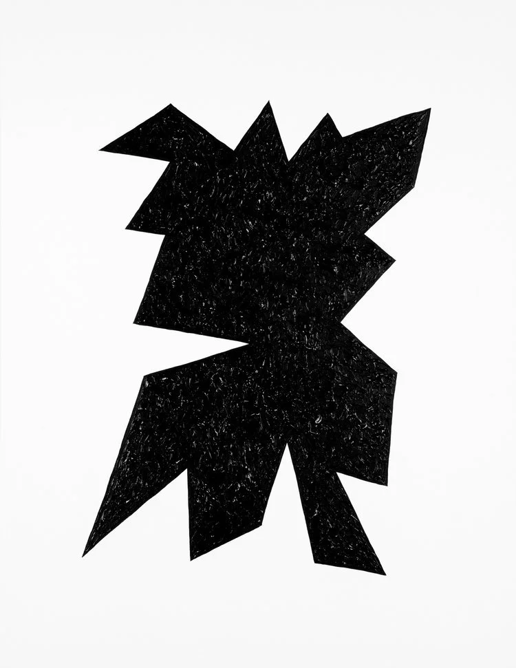 seed 4.4 marks a shift in scale and spatial orientation within the seeds series. composed in a stark black form against a white ground, the painting presents a flattened silhouette—jagged, symmetrical, and suspended—suggesting both containment and rupture. the structure feels deliberate yet volatile, its edges simultaneously enclosing and slicing into the surrounding field.